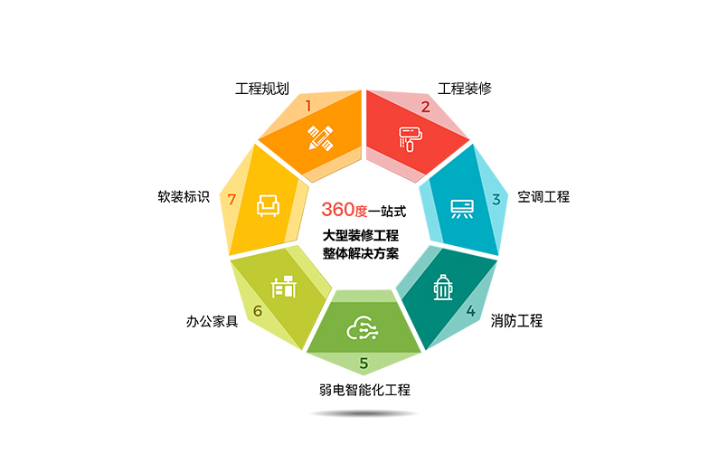 大型裝修工程一站式解決方案,裝修+空調+消防+水電+弱電,一體化施工,省時省心省力!
